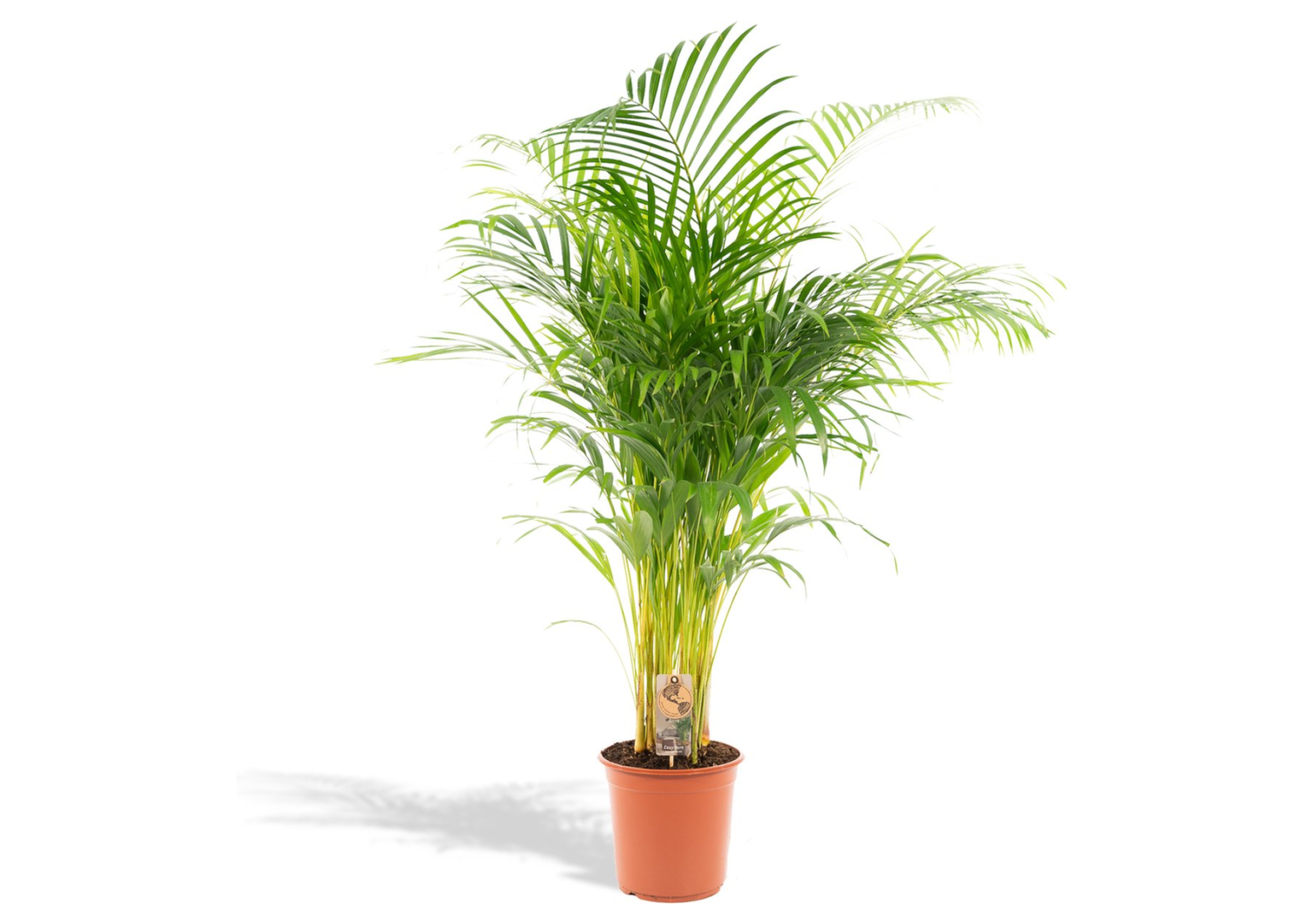 Die Areca-Palme (Dypsis lutescens) ist eine beliebte luftreinigende Zimmerpflanze. Am besten hält man die Pflanze drinnen. Diese tropische Pflanze gedeiht bei indirekter Sonneneinstrahlung und muss regelmäßig, aber nicht übermäßig gegossen werden. Perfekt für einen frischen, grünen Look in Ihrem Zuhause.